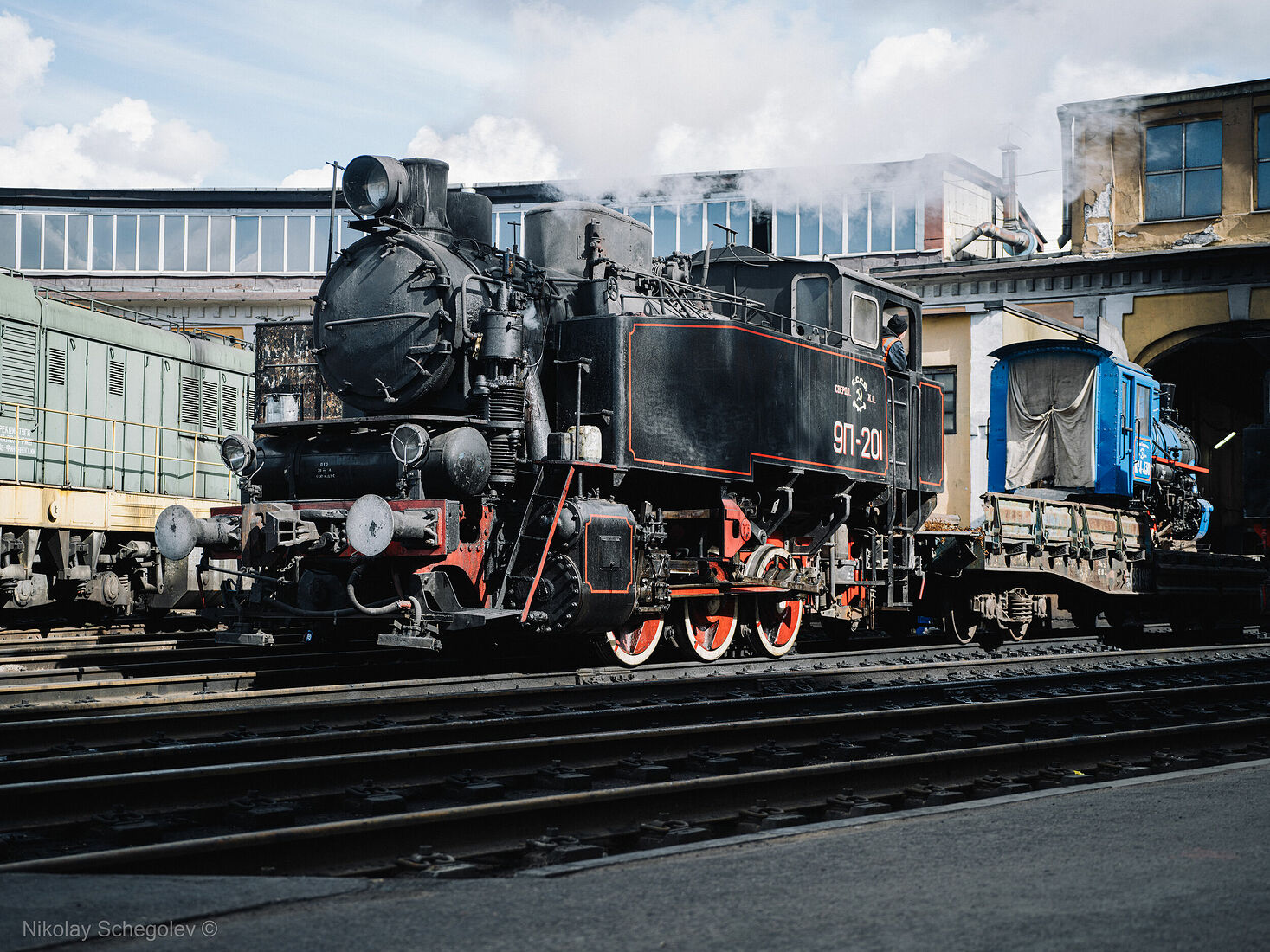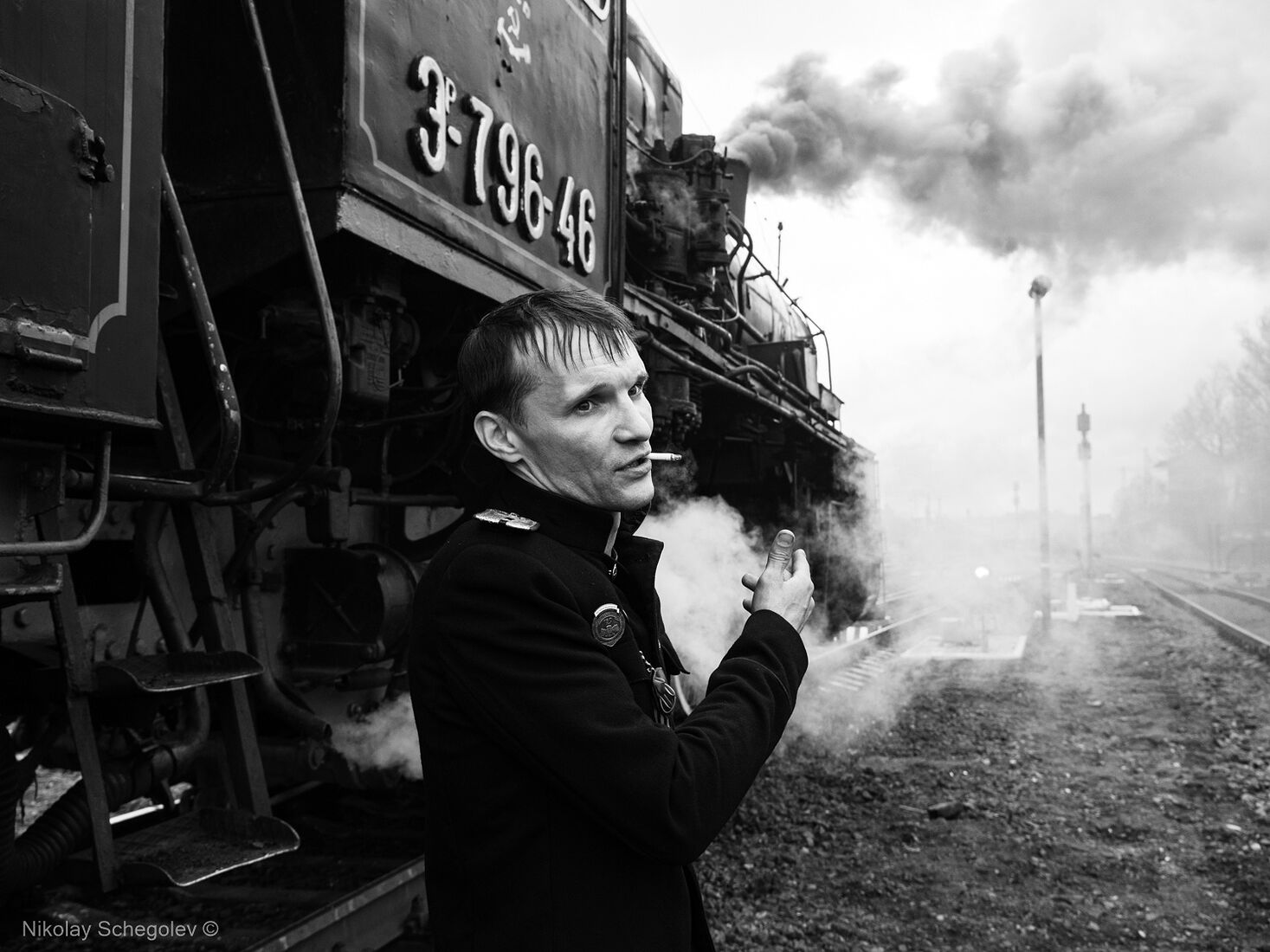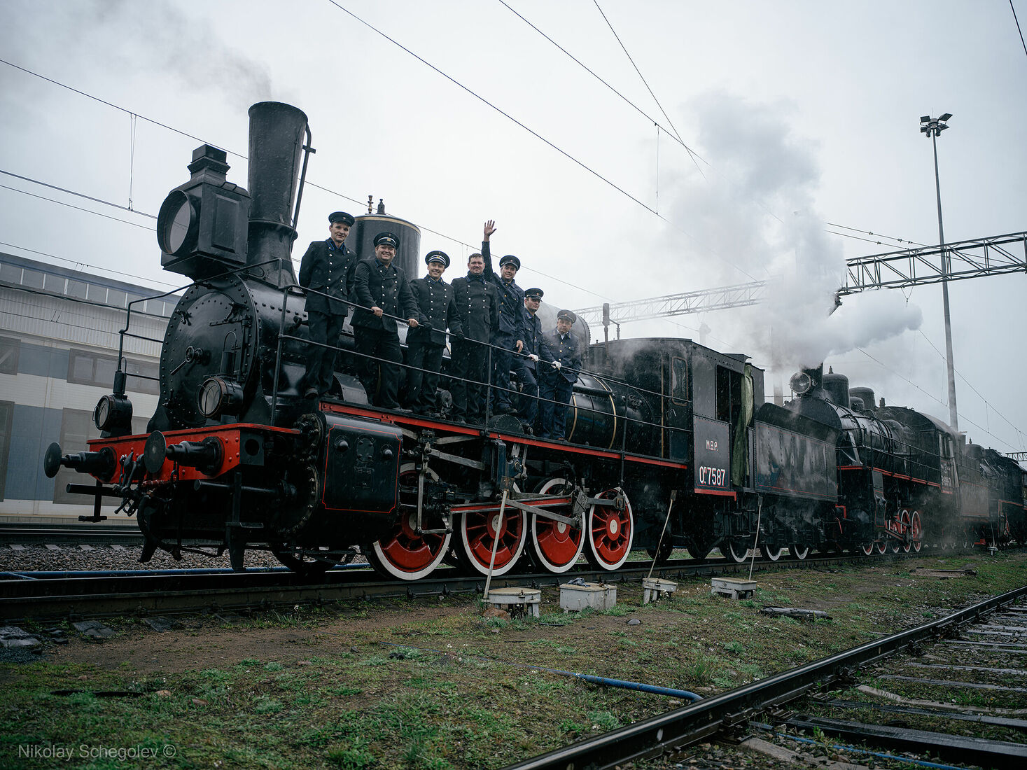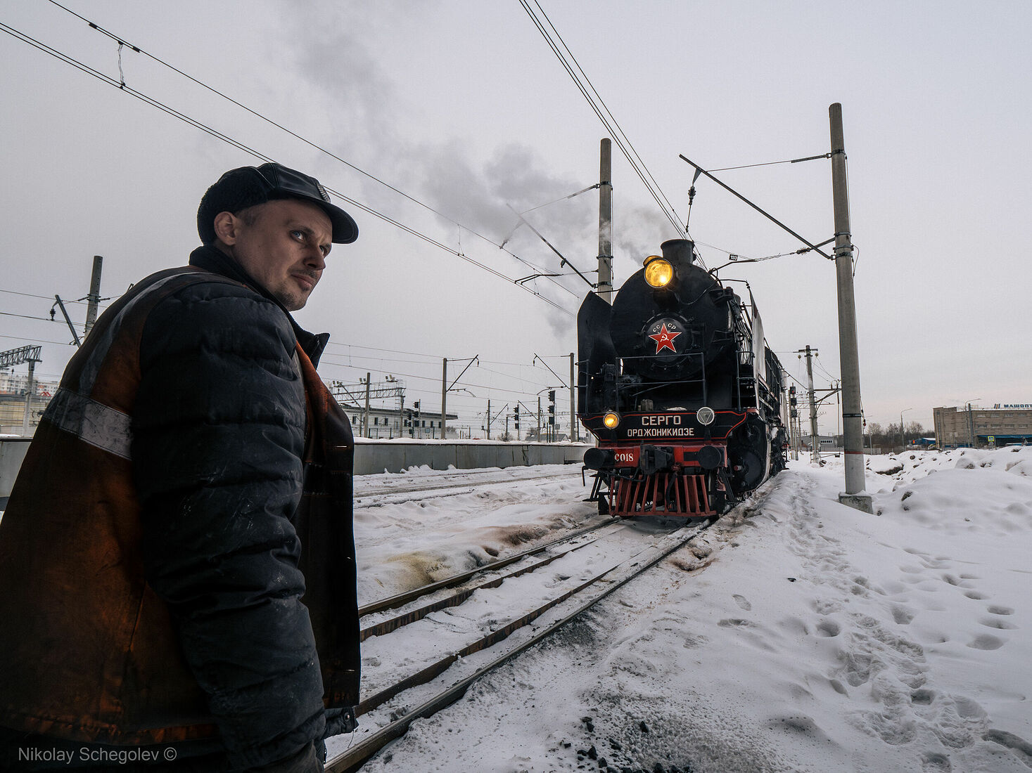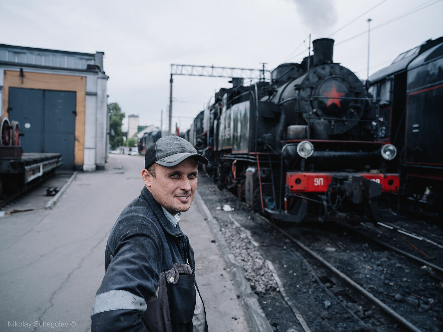 Photographer Alexey Smirnov with Pavel Chilin’s steam locomotive (2024)