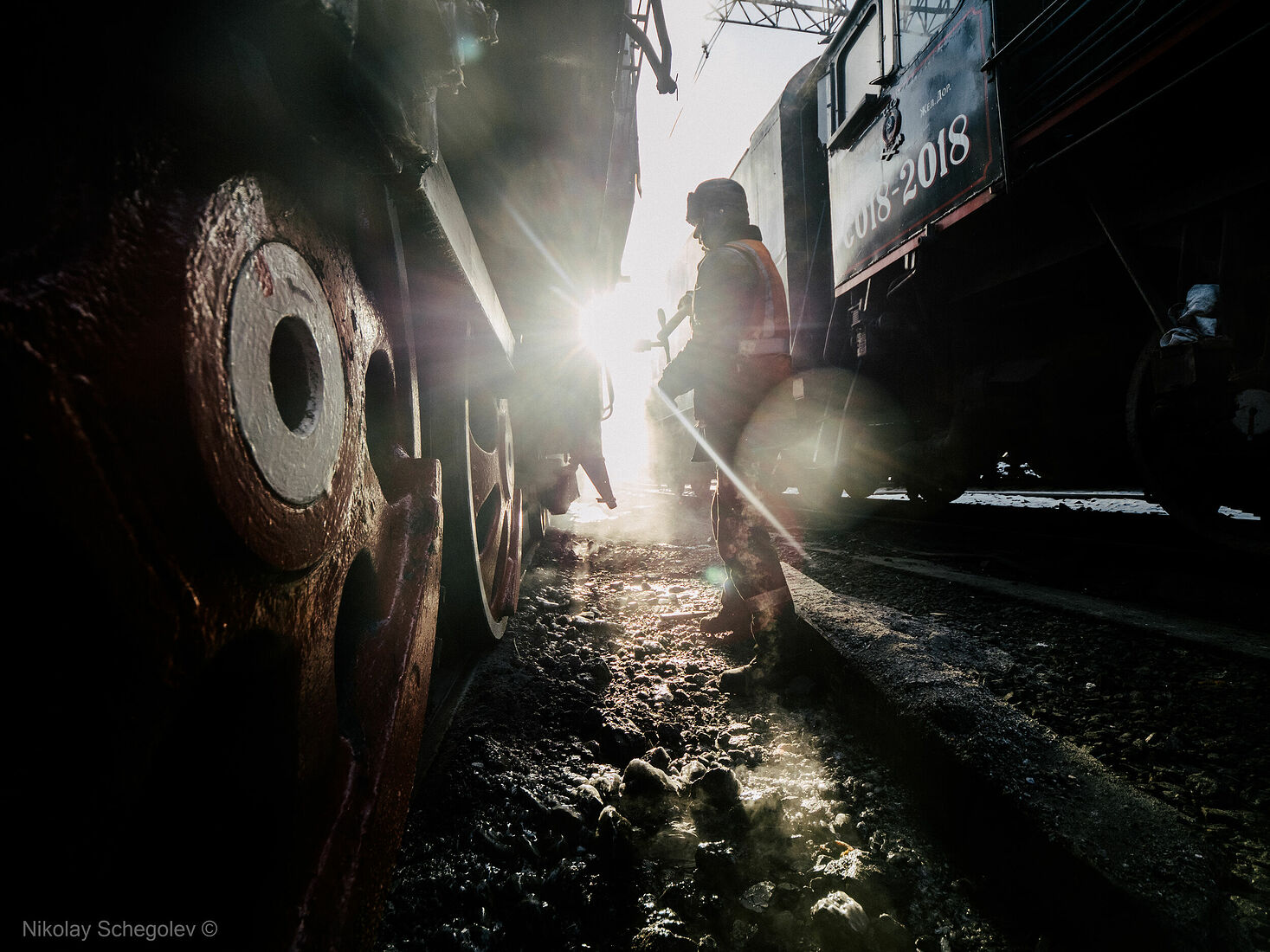 Steam locomotive driver Andrey Ushakov taps the wedges of the captured TE-322 steam locomotive (2018)