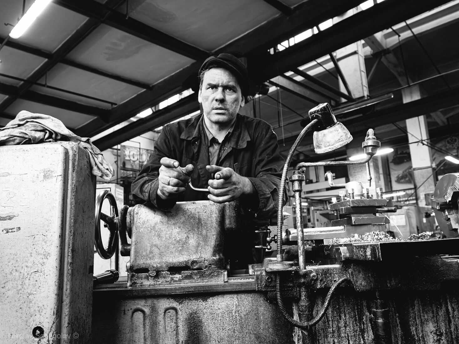 Portrait of locomotive driver Igor Shugaev at work on the Kp4-447 steam locomotive (2017)